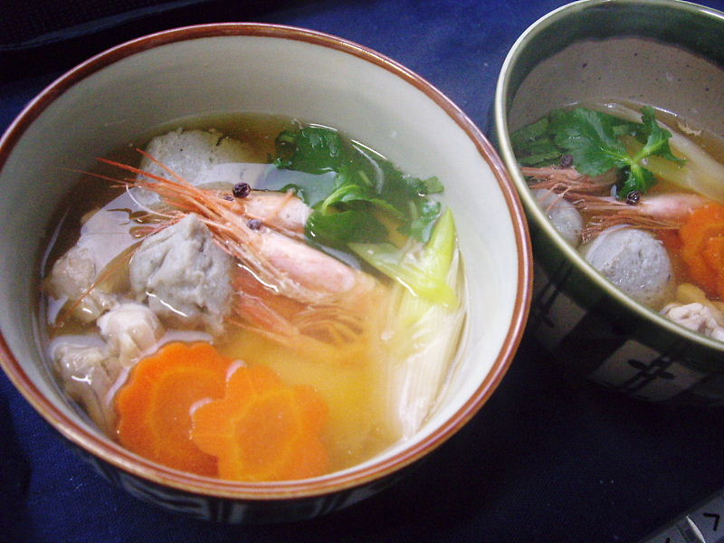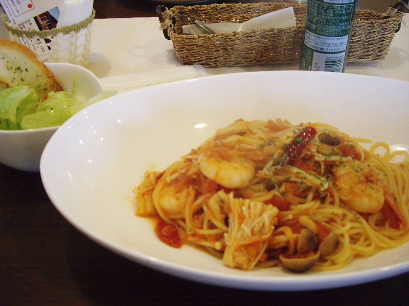 海老と唐辛子ときのこのトマトスープスパゲッティー