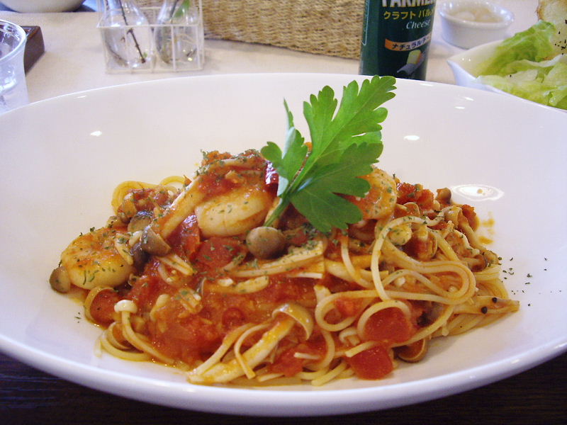 海老ときのこと赤唐辛子のトマトソーススパゲッティ