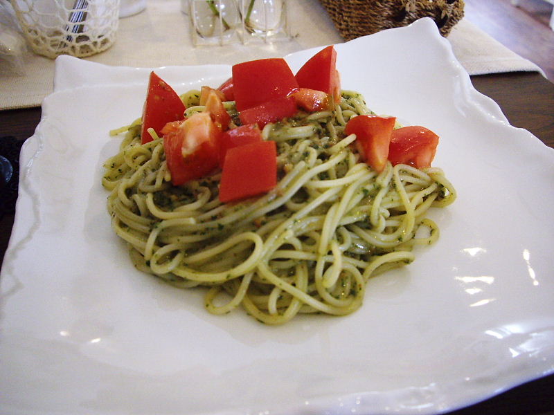 今日のランチは私がバジルのパスタ。