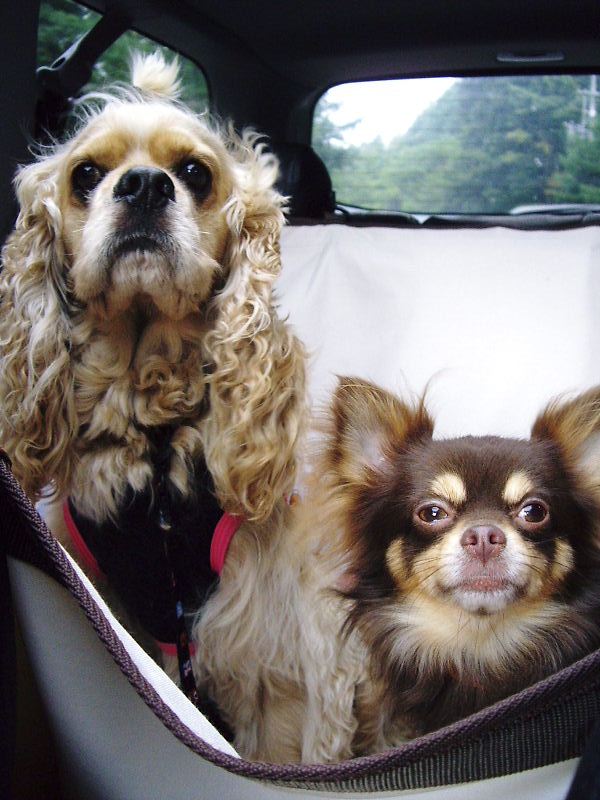 車の窓から顔を出してうれしそうに外を見るぶる。