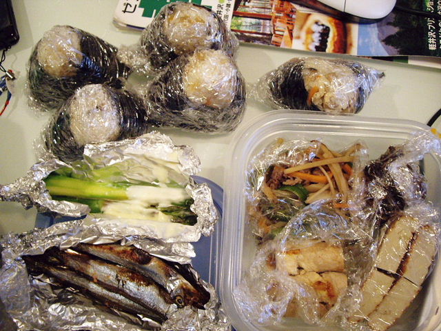 炊き込みごはんのおにぎりとたくさんのお料理を